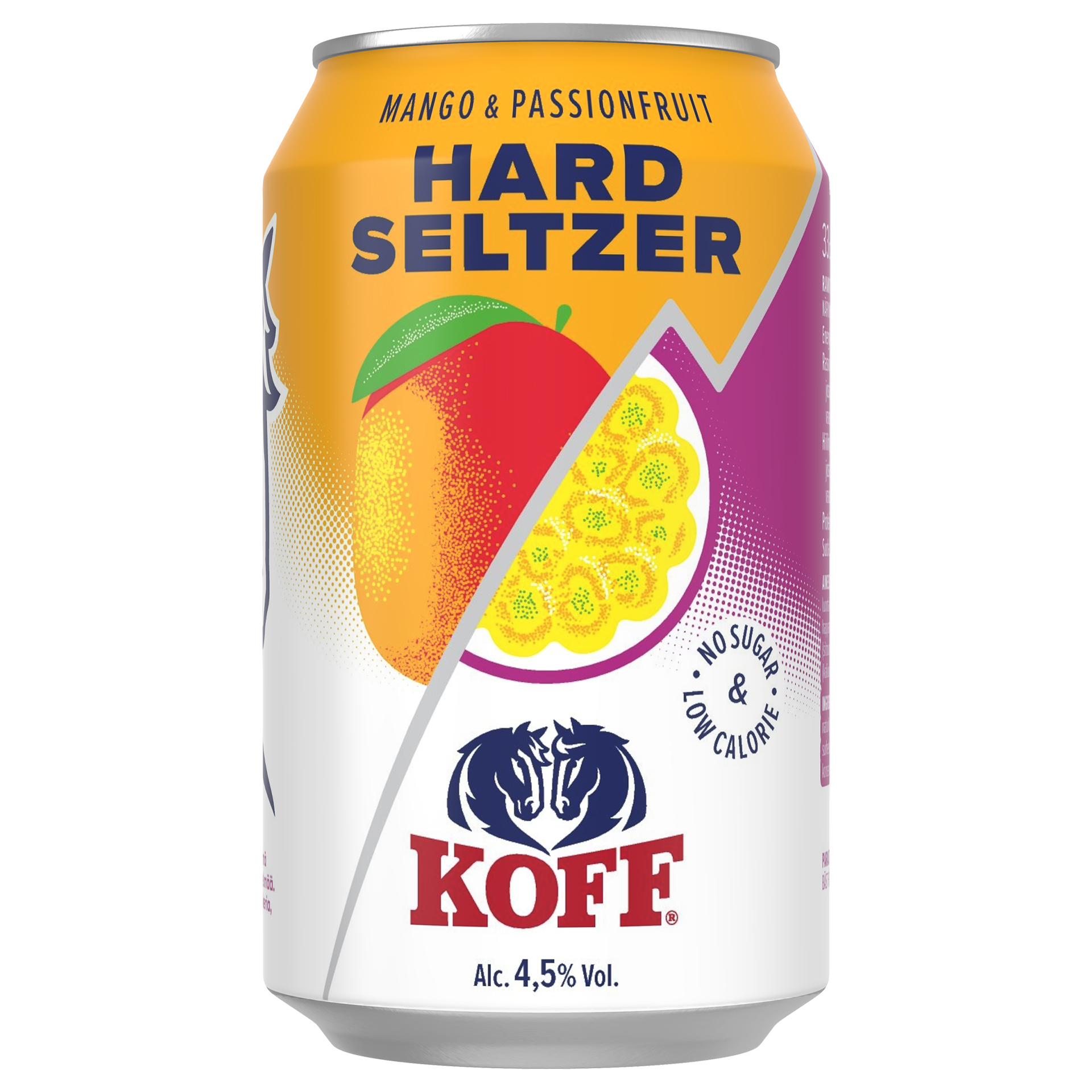 KOFF Hard Seltzer Mango-Passionfruit 4,5% on raikas ja vähäkalorinen alkoholijuomasekoitus, jonka maussa yhdistyvät trooppinen mango ja passionhedelmä sekä terästetty hiilihapotettu vesi.