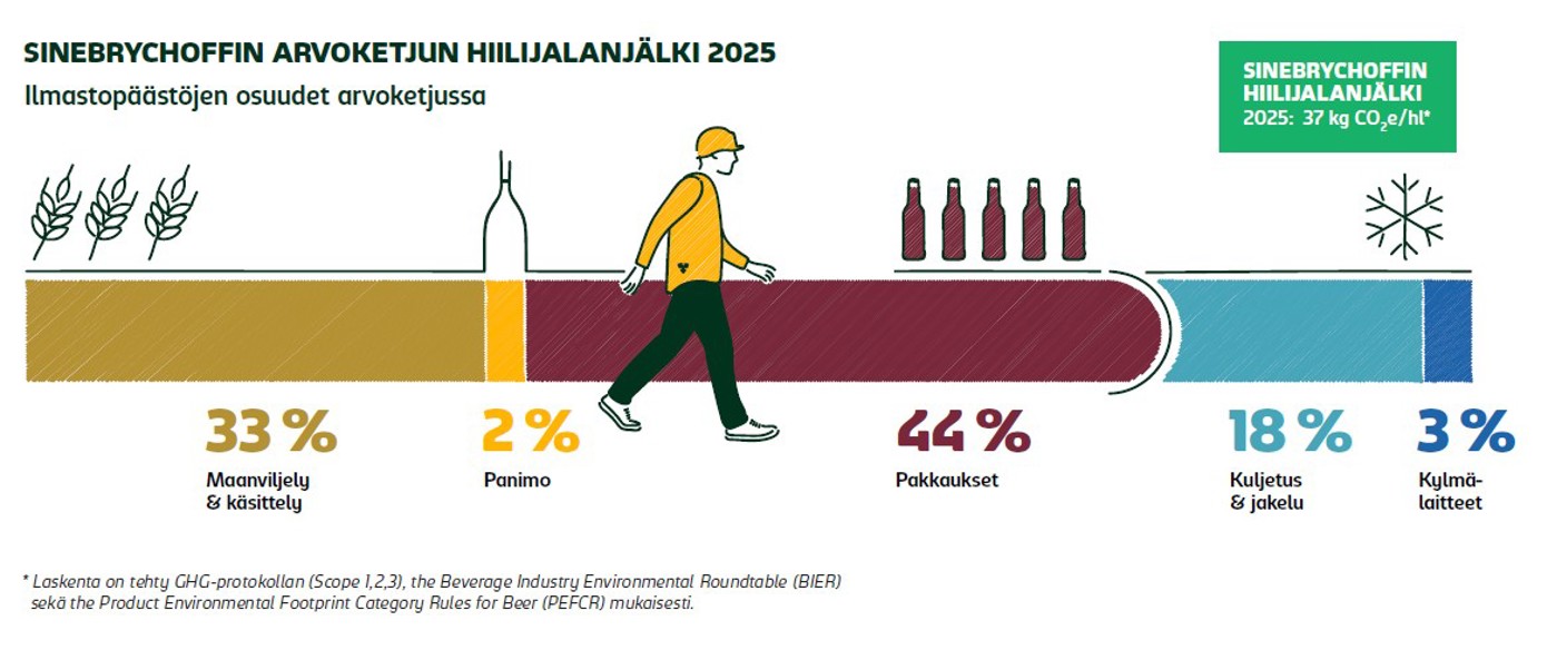 Sinebrychoffin juomien arvoketjun hiilijalanjälki oli 2025 noin 37 kg CO2e/hl, vähentyen kolme kg CO2e/hl edellisvuodesta eli 7,5 %. Laskentamenetelmiä on samalla päivitetty.
