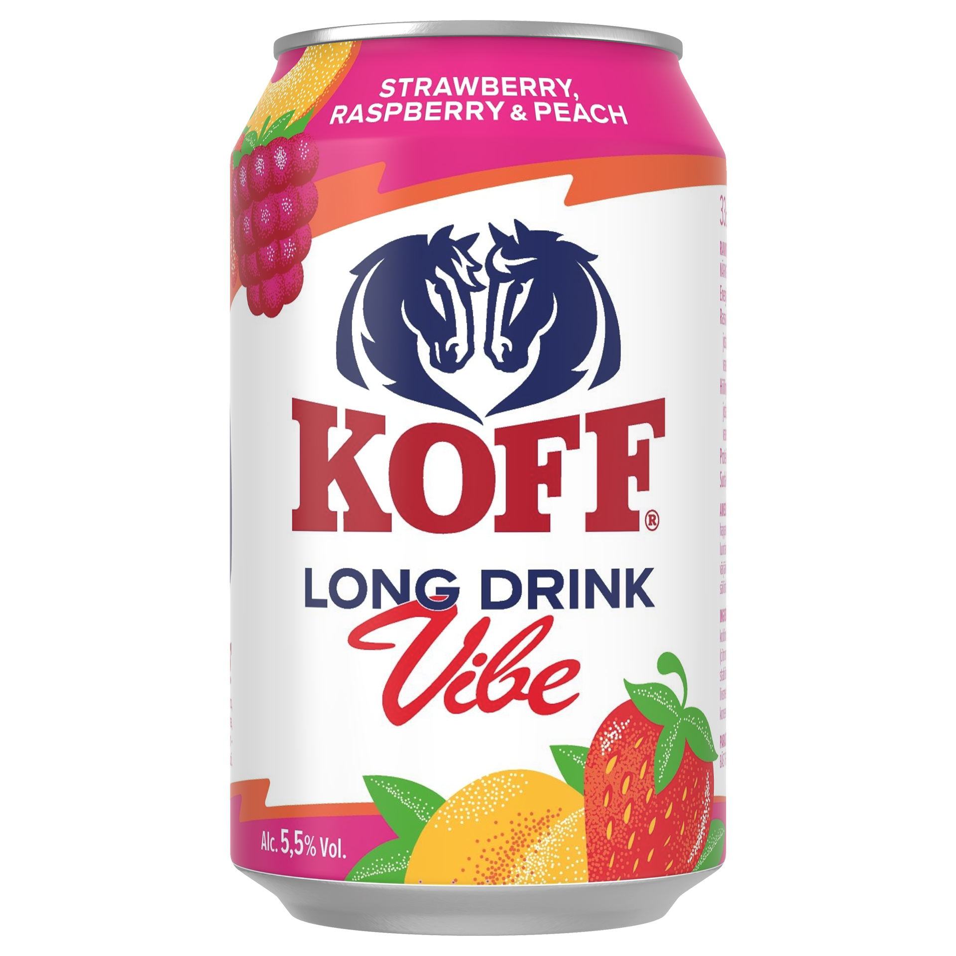 KOFF Long Drink Vibe Strawberry-Raspberry-Peach 5,5% on herkullinen ja marjaisan maukas lonkero, jonka maussa yhdistyvät makea mansikka, pirteä vadelma ja pehmeä persikka.